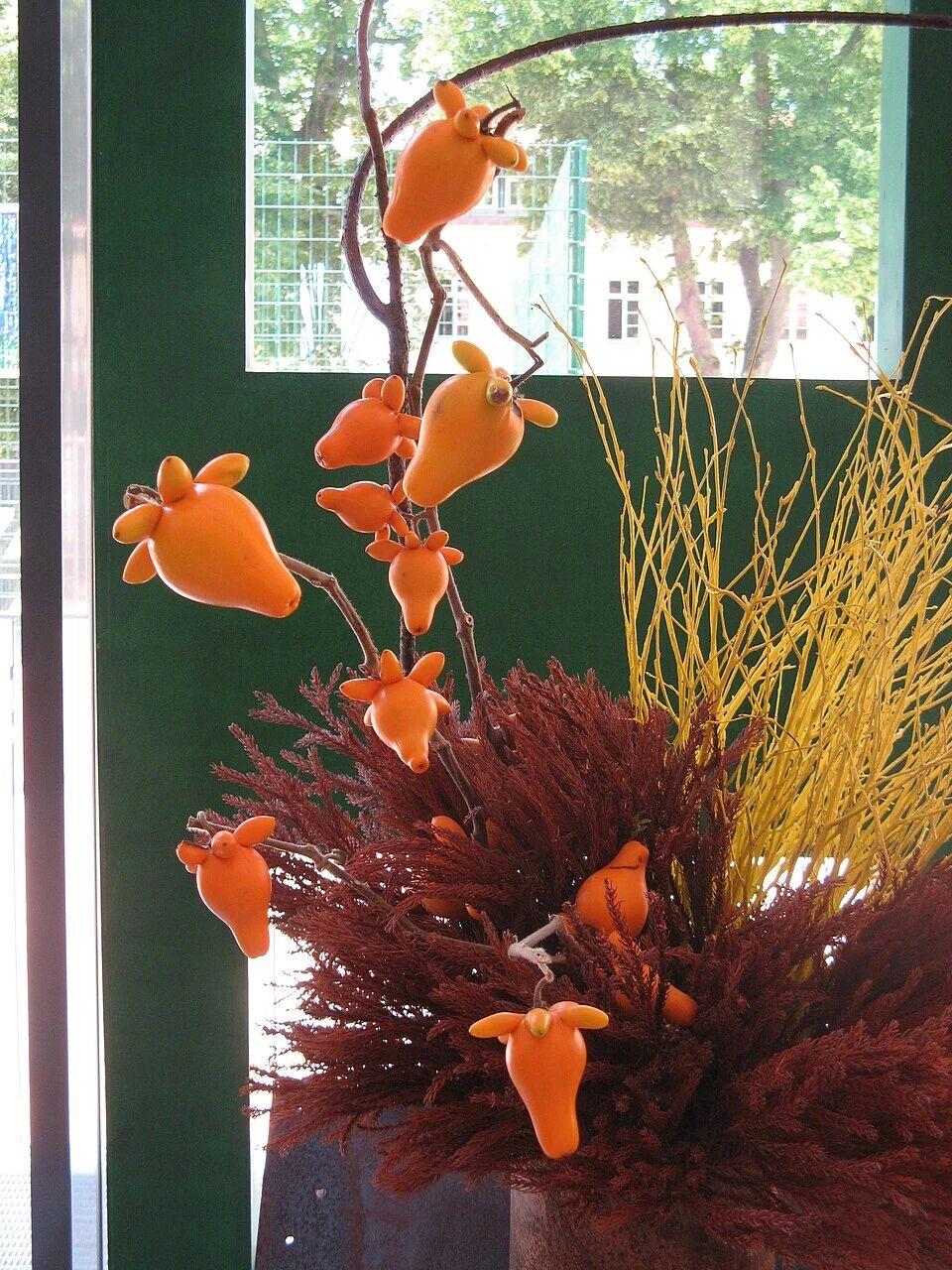 市场上出售的乳茄,看上去硕果累累,格外繁茂,实际上自然生长的乳茄果实并没有这么密集。原来,用来出售的观赏乳茄都是商家提前将果实剪下来,固定在底座上做出造型,再插上其他植物的绿叶做出来的。为什么不直接用乳茄自身的叶片?这是因为,乳茄的茎和叶子表面都长着黄色的针状尖刺,虽然较为稀疏,但仍有把人刺伤的可能性。而且,它的叶子观赏性也不太强。